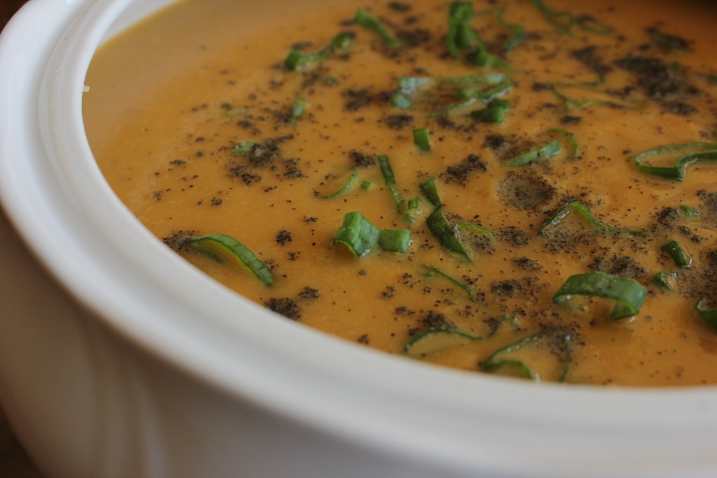 Esta crema lleva coliflor, brócoli, algo de calabaza y tallos verdes de cebolleta. Además le he puesto un ajo muy grande, una cucharada de concentrado de tomate y levadura nutricional.