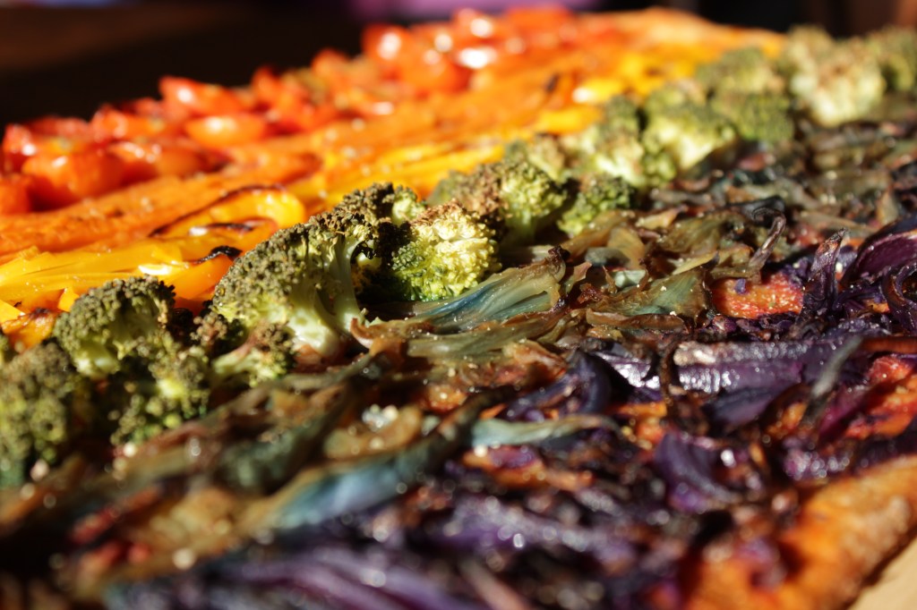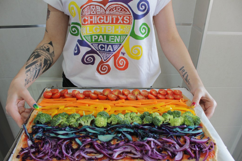 Disponemos la masa en una rejilla o bandeja y extendemos un poco de tomate triturado y colocamos las verduras formando un arcoiris. Sazonamos al gusto.