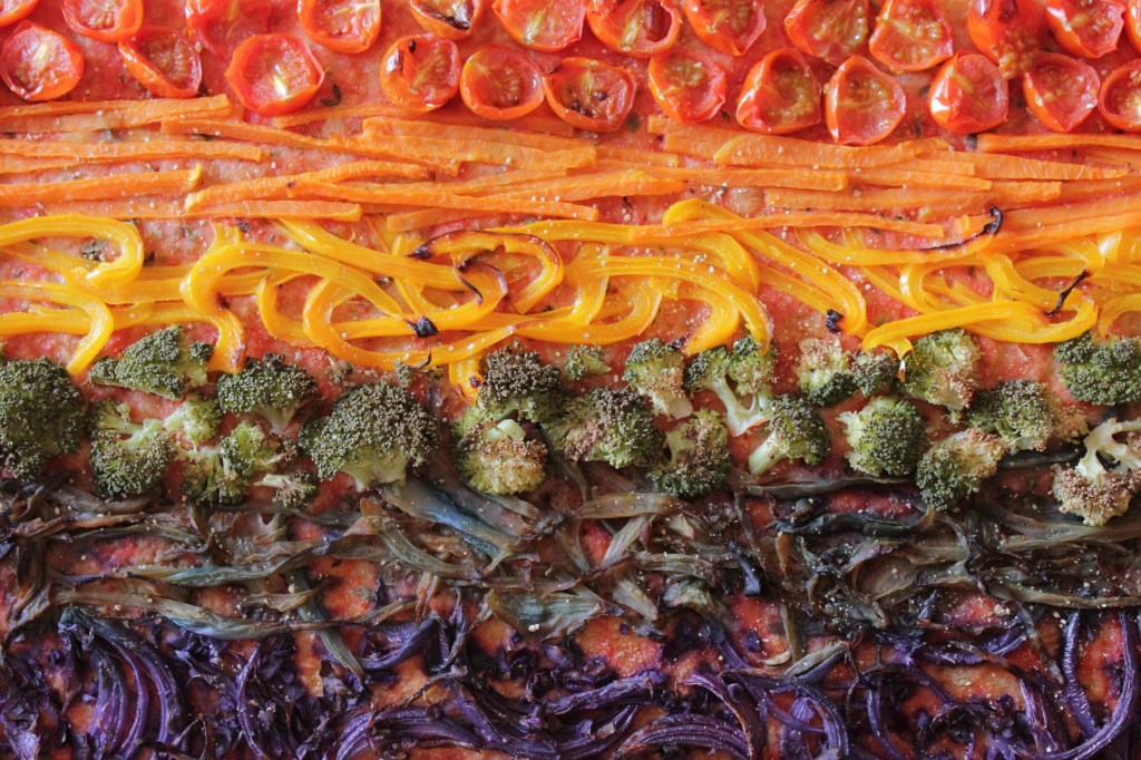 Ingredientes (toppings): 1 cda tomate triturado. Tomates cherry, calabaza, pimiento amarillo, brócoli, lombarda (macerada con un poco de bicarbonato sódico), cebolla morada. Sal y pimienta.